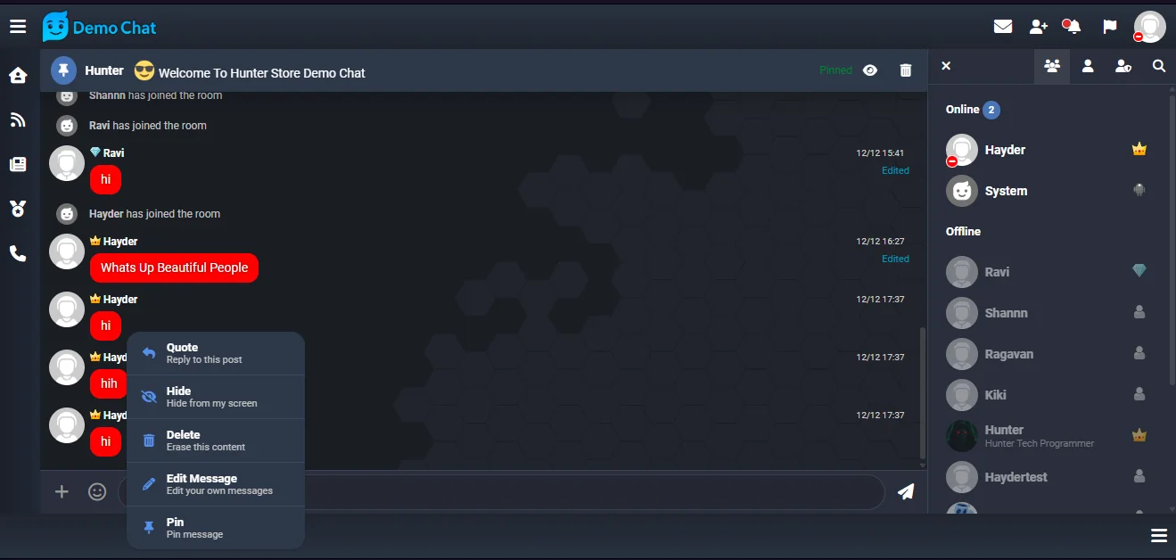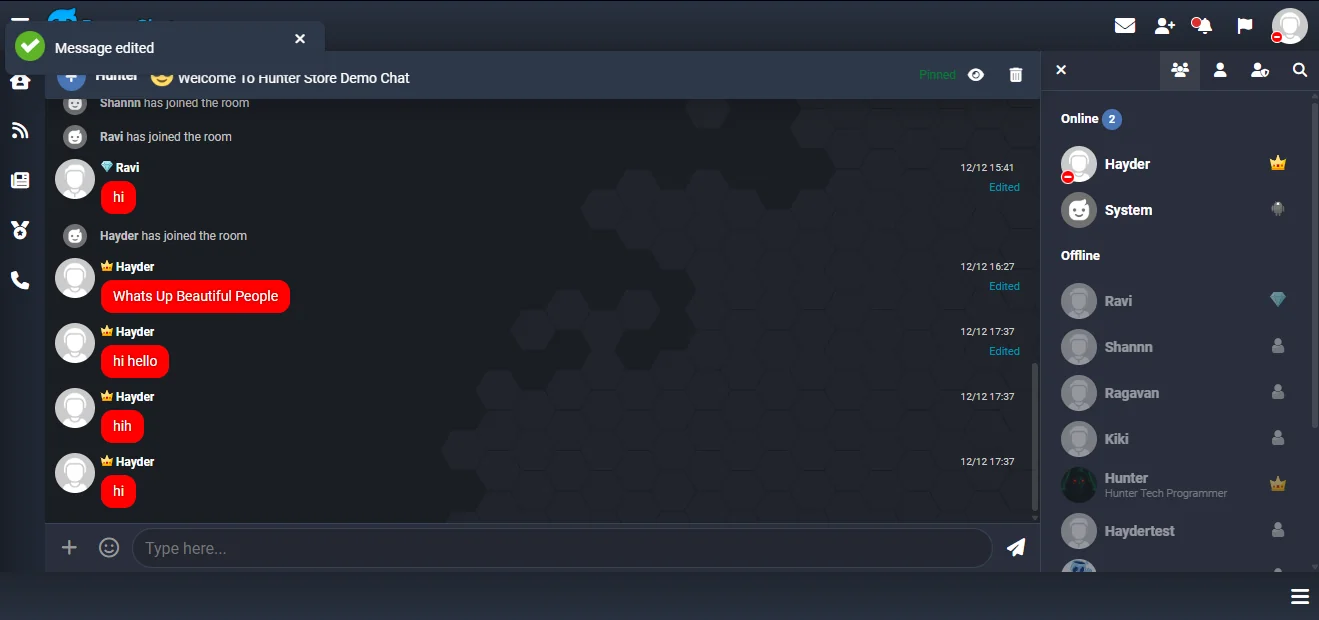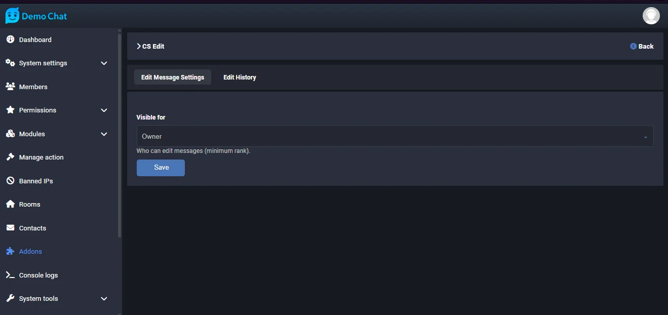 Lets users edit their own chat messages in-place (text and emoji tokens) and immediately updates visible chat with an “Edited” tag. Prevents editing messages that contain uploaded images or non-emoji media. Admins control who can edit via rank settings. Every edit is recorded in an edit history (old → new) with searchable, paginated history view so moderators can review changes. Lightweight ribbon UI for quick edits and safe server-side checks to ensure only message owners can change content.